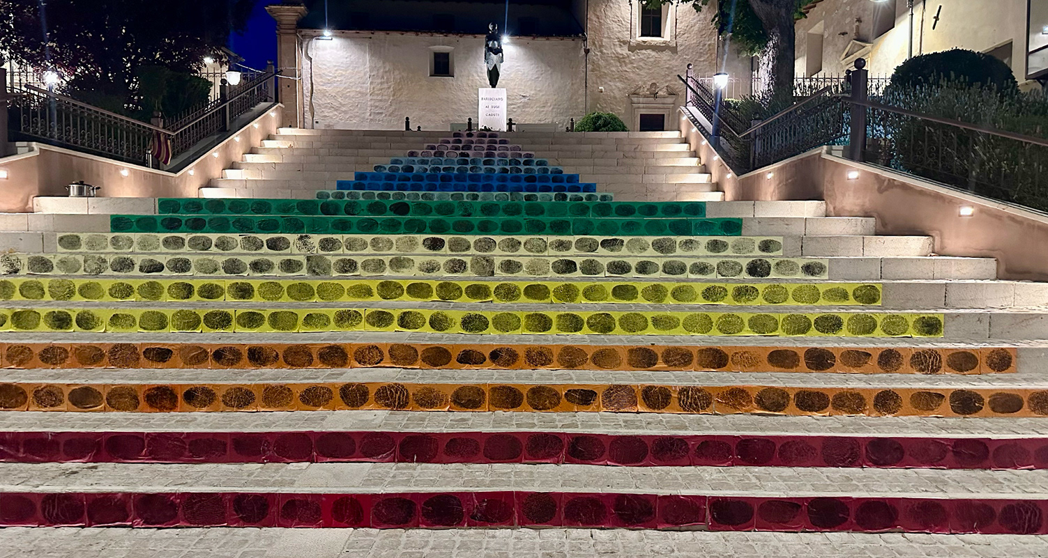Community-based installation, Barisciano, Italy. A series of fingerprints gathered from the residents of Barisciano was later enlarged and transformed into an ephemeral street intervention. What began as an intimate gesture—each person leaving a trace of their presence—became a temporary public artwork, carried by the community and returned to the streets that shaped it. “Art transforms time, spaces, and the people who move through them. This morning, the concepts of artistic installation, urban intervention, and ephemeral art converged on the steps of San Flaviano. The rain will slowly wash everything away.” (Community member)
